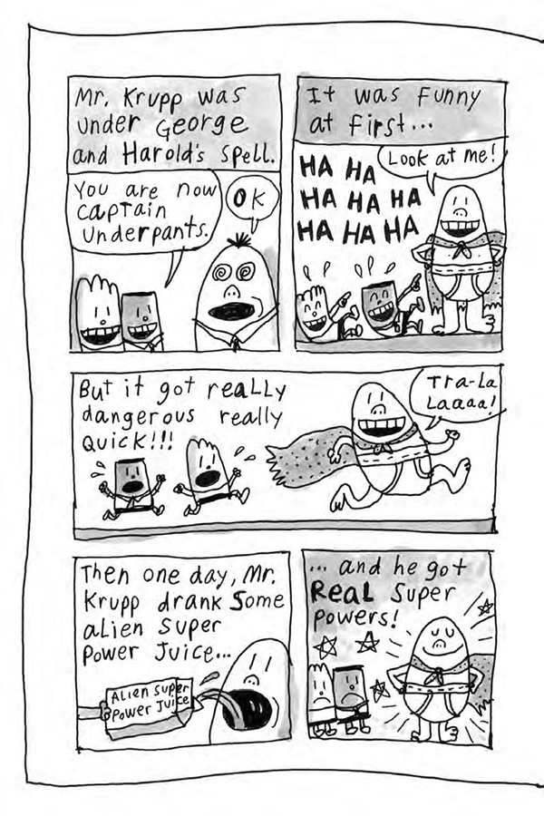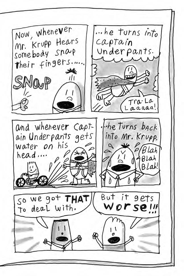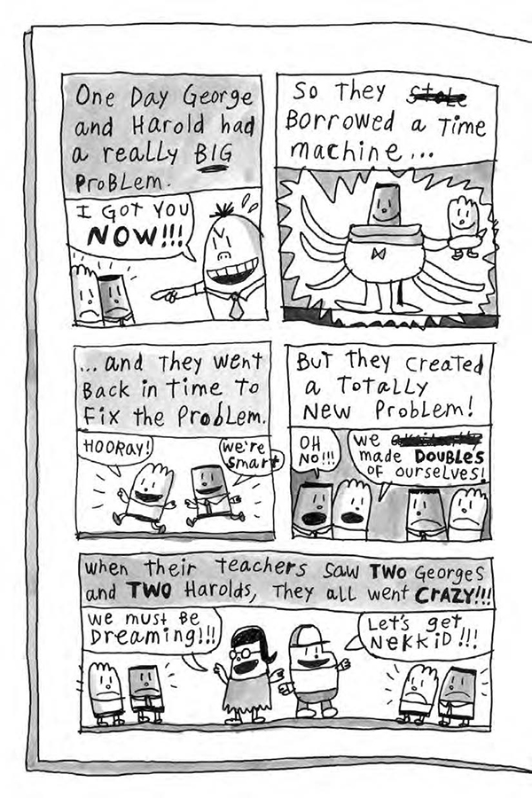 George and Harold, and their doubles, Yesterday George and Yesterday Harold, have a good thing going. Two of them go to school, while the other two hide in the tree house and play video games all day -- then they switch! But when their malicious gym teacher, Mr. Meaner, creates a method of mind-control that turns their fellow students into attentive, obedient, perfect children, the future of all humanity will be in their hands!